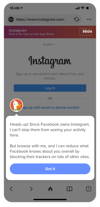 We needed to revise a dialog informing users that the DuckDuckGo Privacy Browser app was unable to block Facebook's trackers when users visited the Instagram website. From user testing, we found that users thought the dialog meant that the app would protect them from Facebook's trackers.