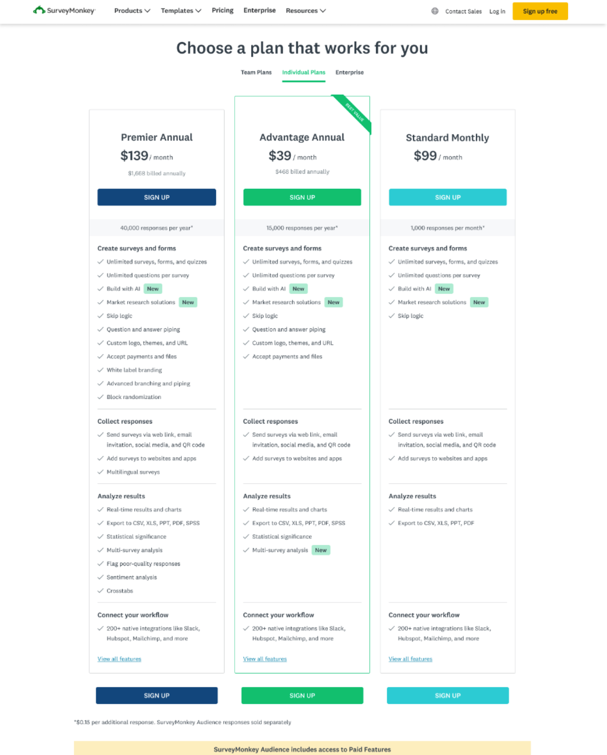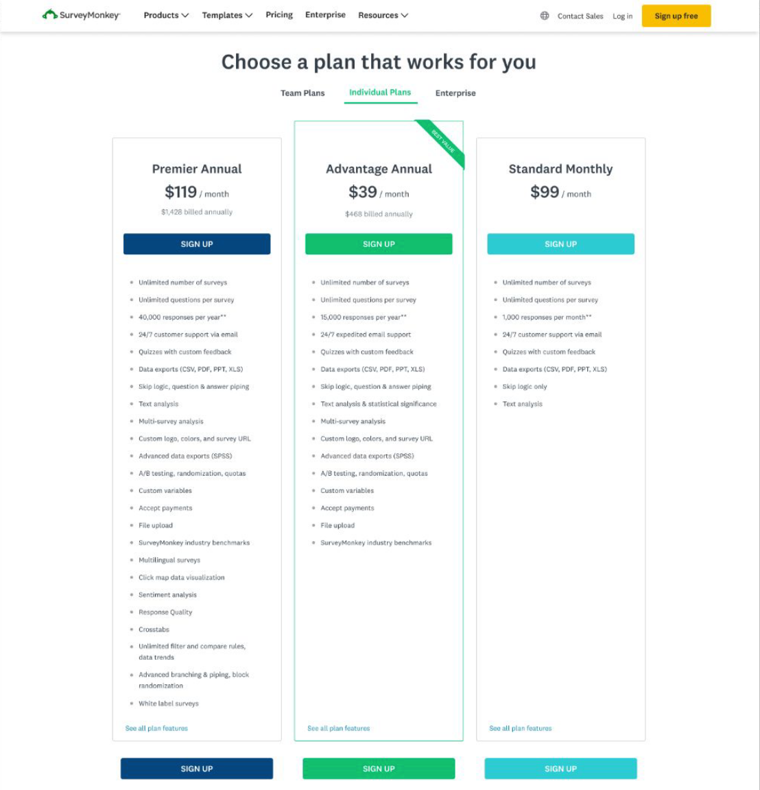 SurveyMonkey’s pricing page lacked a clear presentation of plans and features. This inhibited value discovery and limited conversions.
