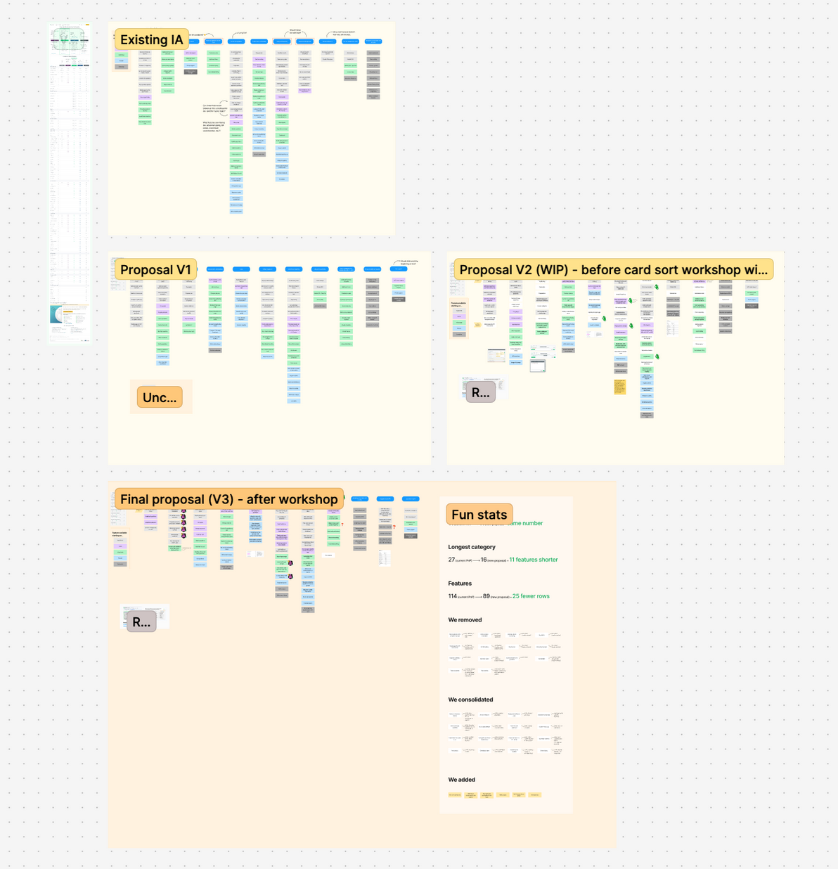 While I collaborated with the Product Manager (PM) to select features that would be most competitively advantageous to show on the Summary pages in Treatment 2, I conducted a content audit on the Details pages. Using card sorting in Figma, I listed out all the features and grouped them into their existing categories. Then I created a set of new categories and reorganized the features more logically, with new copy for clarity. This process involved researching the more vaguely named or complex features to better understand and sort them. My product design and marketing partners, as well as the PM, gave feedback on my recommendations.